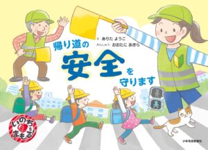 下校をする低学年の子どもたちが、道を歩いたり横断したりする交通ルール、マナーと共に、安全でありますよう願いを込めた絵本です。
